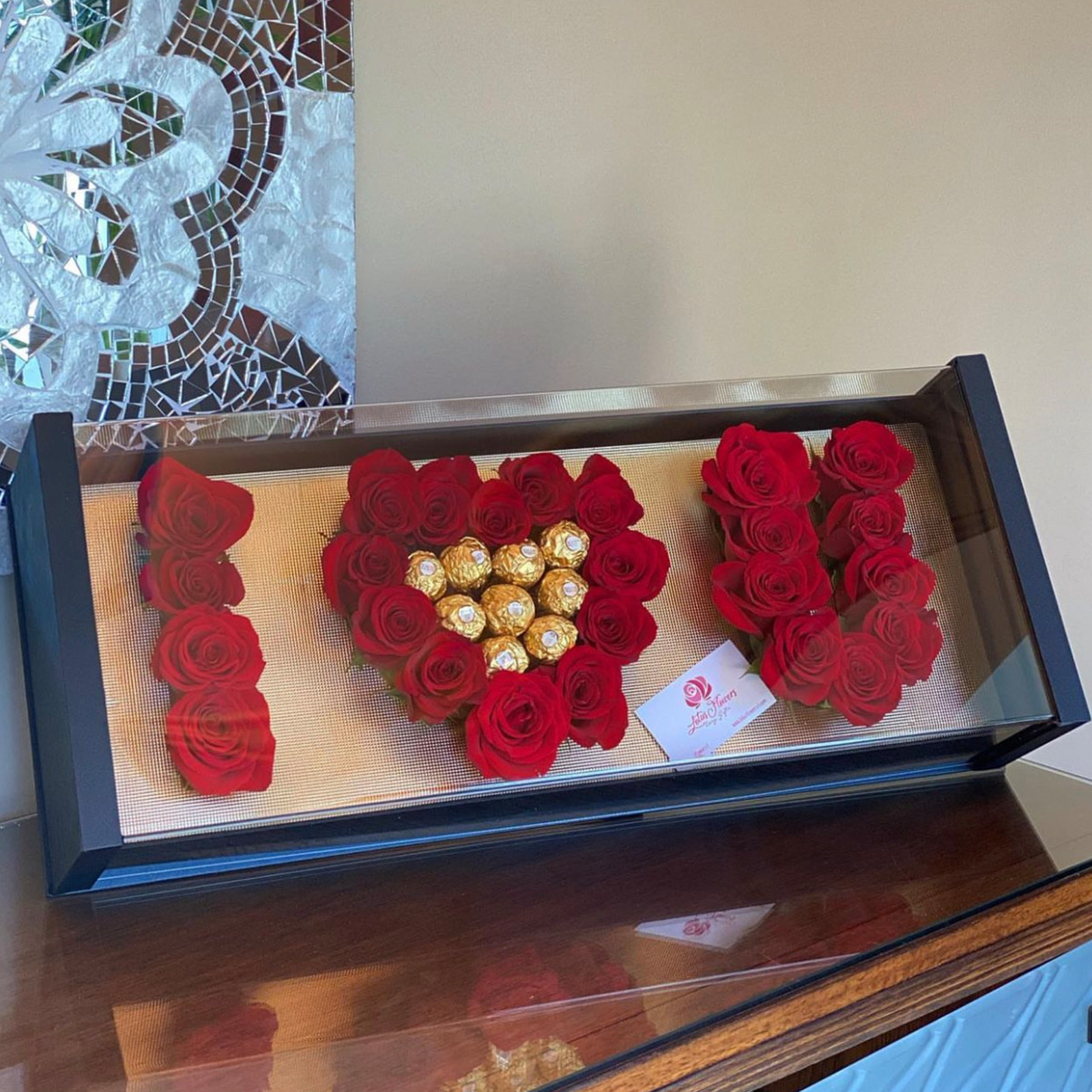 This uniquely heartfelt arrangement features vibrant red roses meticulously arranged to spell “I Love U”, adorned with gleaming Ferrero Rocher chocolates, all elegantly encased within a sleek glass display box.