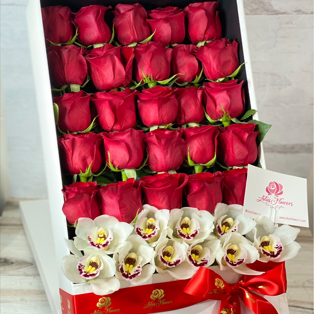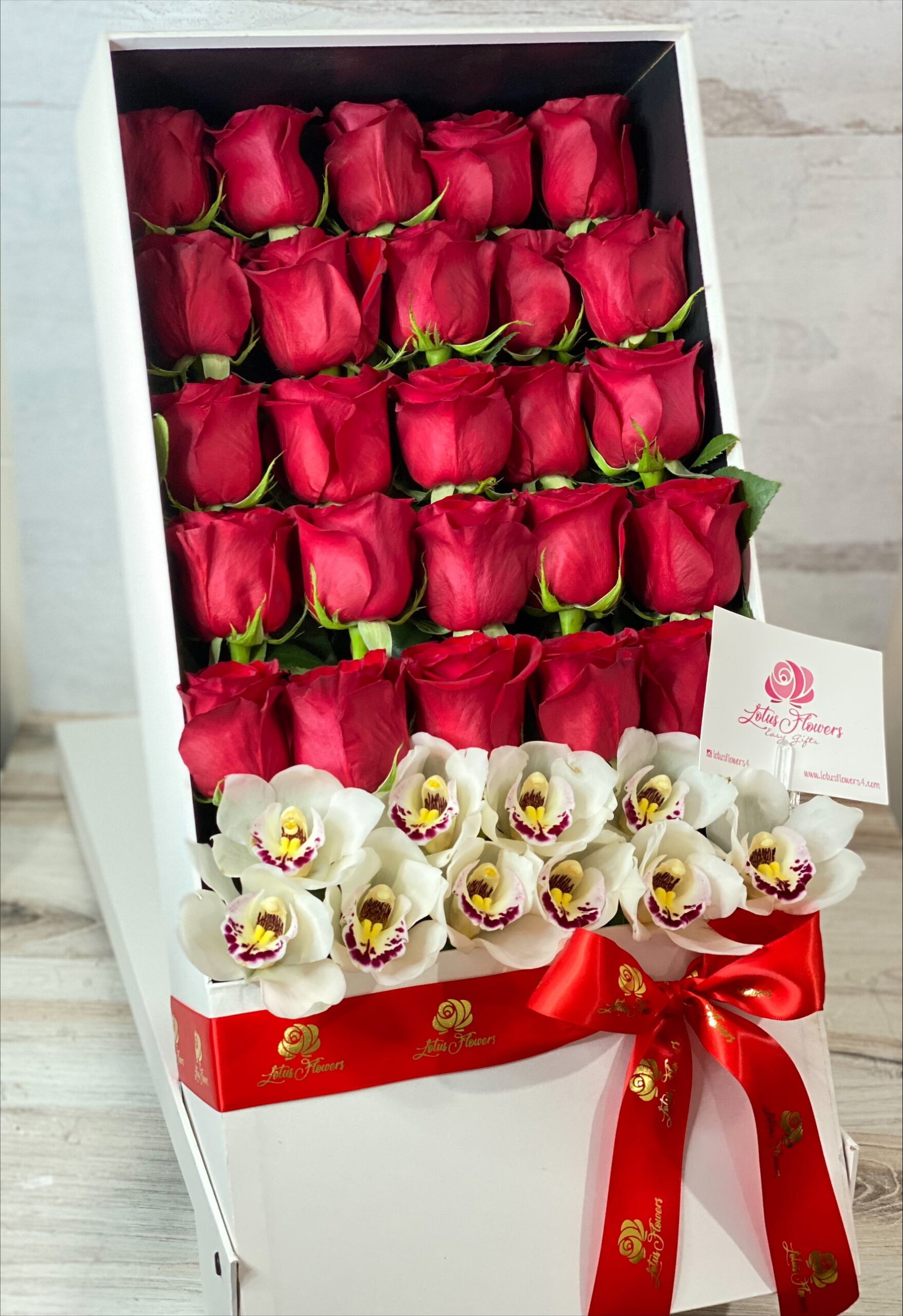 This thoughtfully curated arrangement is more than just flowers; it’s an experience. The roses declare your love with timeless beauty, while the orchids add a touch of ethereal grace, creating a captivating visual melody. The elegant white box, complete with a subtle stand and tied with a luxurious red bow, elevates this gift to a new level of refined presentation, making the unveiling a truly special moment.